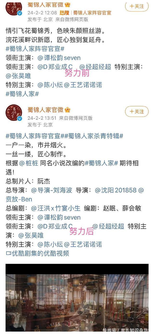 至于为什么说谭松韵的粉丝被误导了呢,因为郑业成复兴的番位争议,指的是男主和男二的番位,但是谭松韵的粉丝误合计是男主和女主撕番位,天然出现这样的诬蔑并不奇怪,毕竟以往的剧方,也莫得像这次《蜀锦东说念主家》这样干的,以至郑业成的粉丝也承认这是大女主戏,于是接头区就颠倒奇怪,一个在讲明,一个在炮轰。
