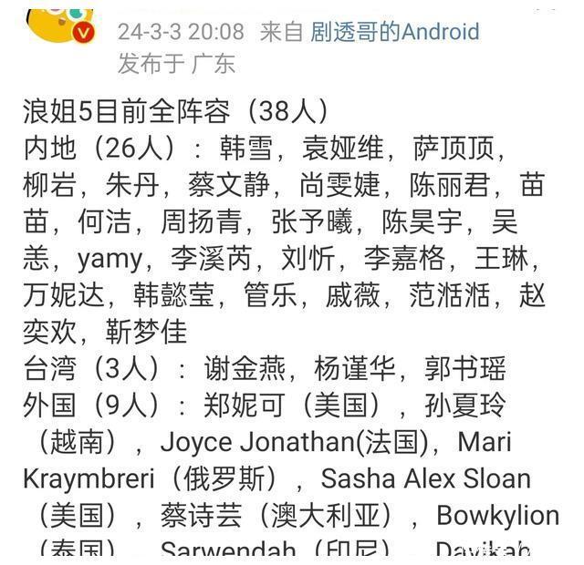 相关《浪姐5》的气势也传出了多个版块,从最新的版正本看,本季嘉宾多达38东说念主,却无全球熟知的大咖,外籍嘉宾多达9东说念主,均创下了历季节目之最。