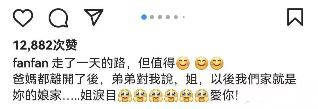 范玮琪畸形感动,在酬酢平台写谈:“爸妈齐离开后,弟弟对我说,姐,以后咱们家即是你的娘家……姐泪目,爱你!”
